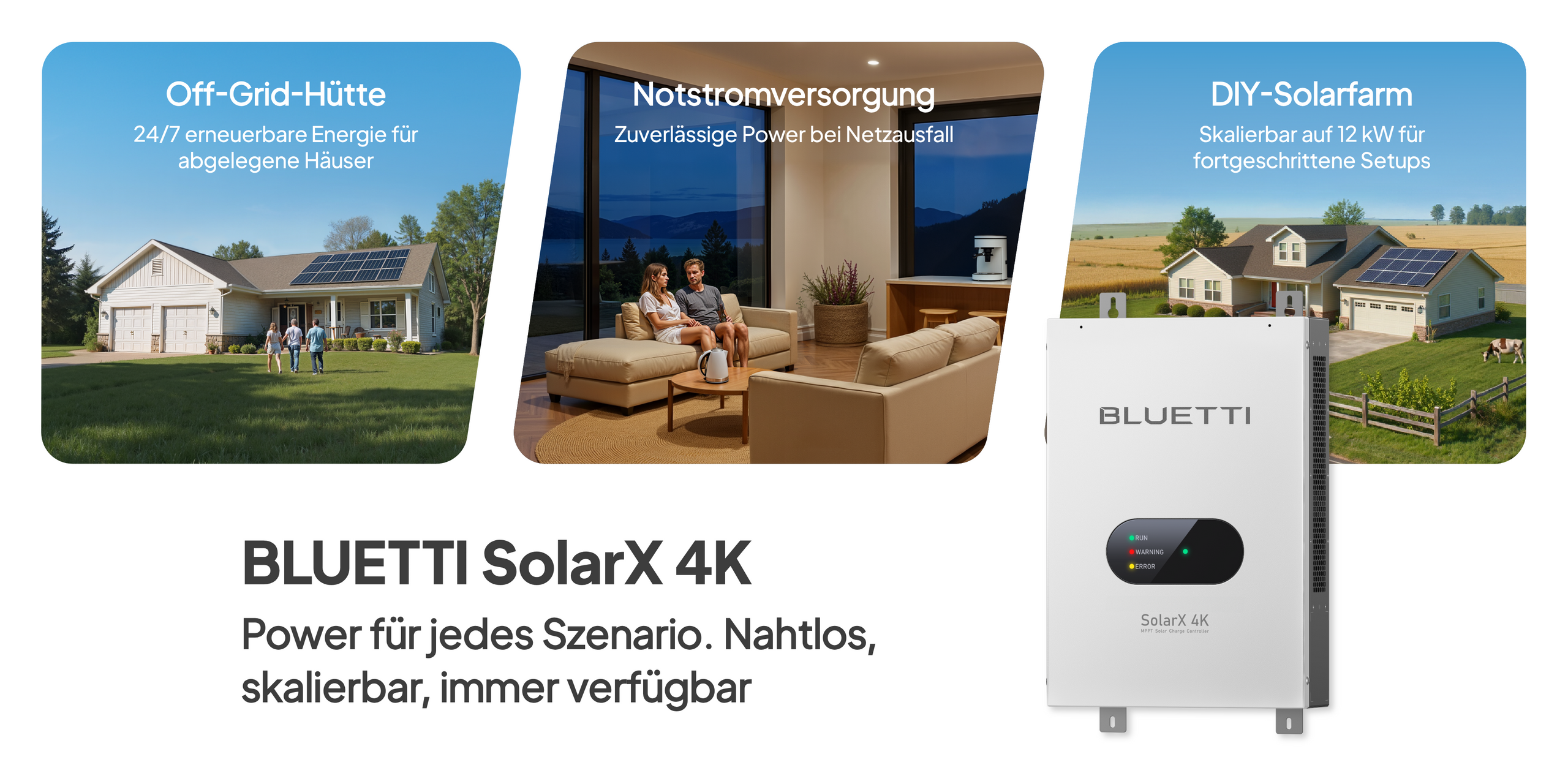 Mit SolarX 4K können Sie selbst entscheiden, wie viel Solarenergie zu Ihrem Leben passt. Verwenden Sie ein Gerät für den täglichen Bedarf oder bis zu drei Geräte für Ihr gesamtes Zuhause. Es wird über eine AC-Kopplung an Ihre bestehende Solaranlage angeschlossen, sodass die DC-Eingänge von BLUETTI für zusätzliche Panels frei bleiben. So erhalten Sie schneller mehr Energie, ohne Ihr System zu belasten.