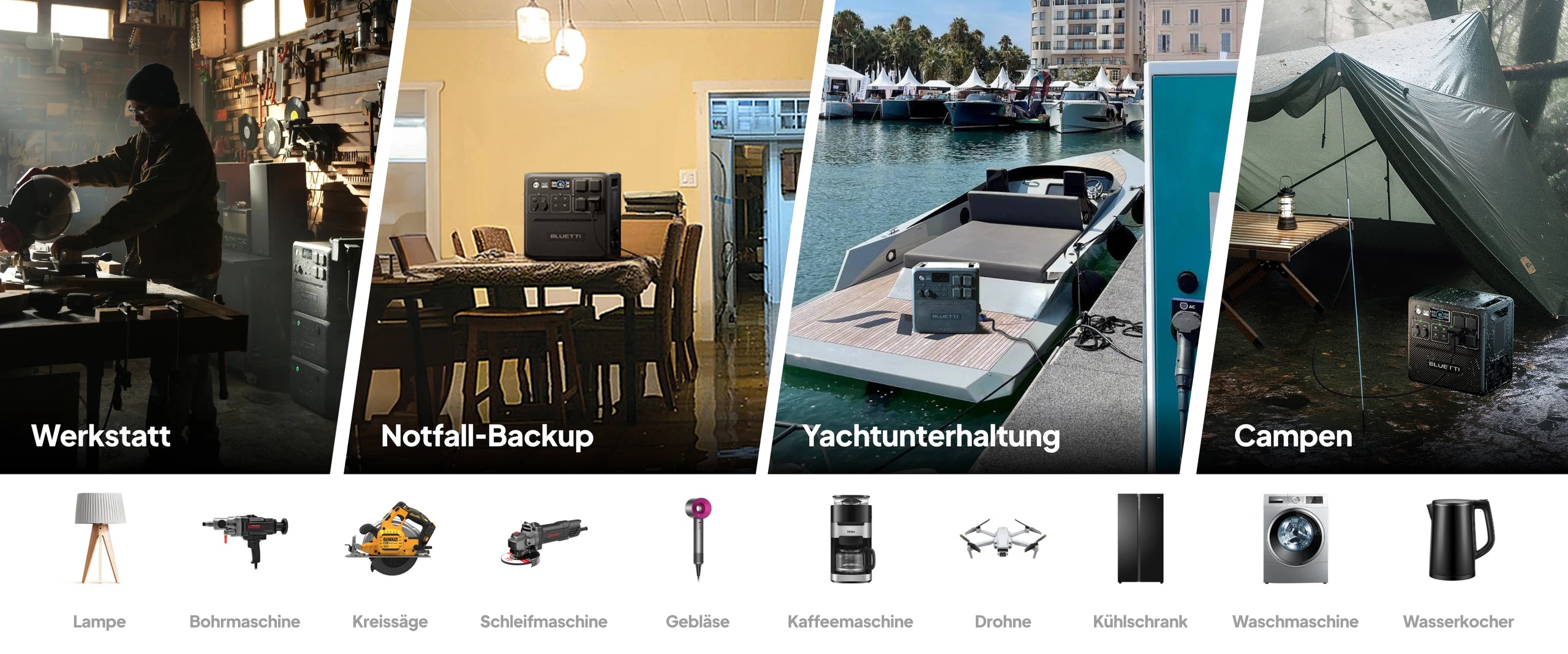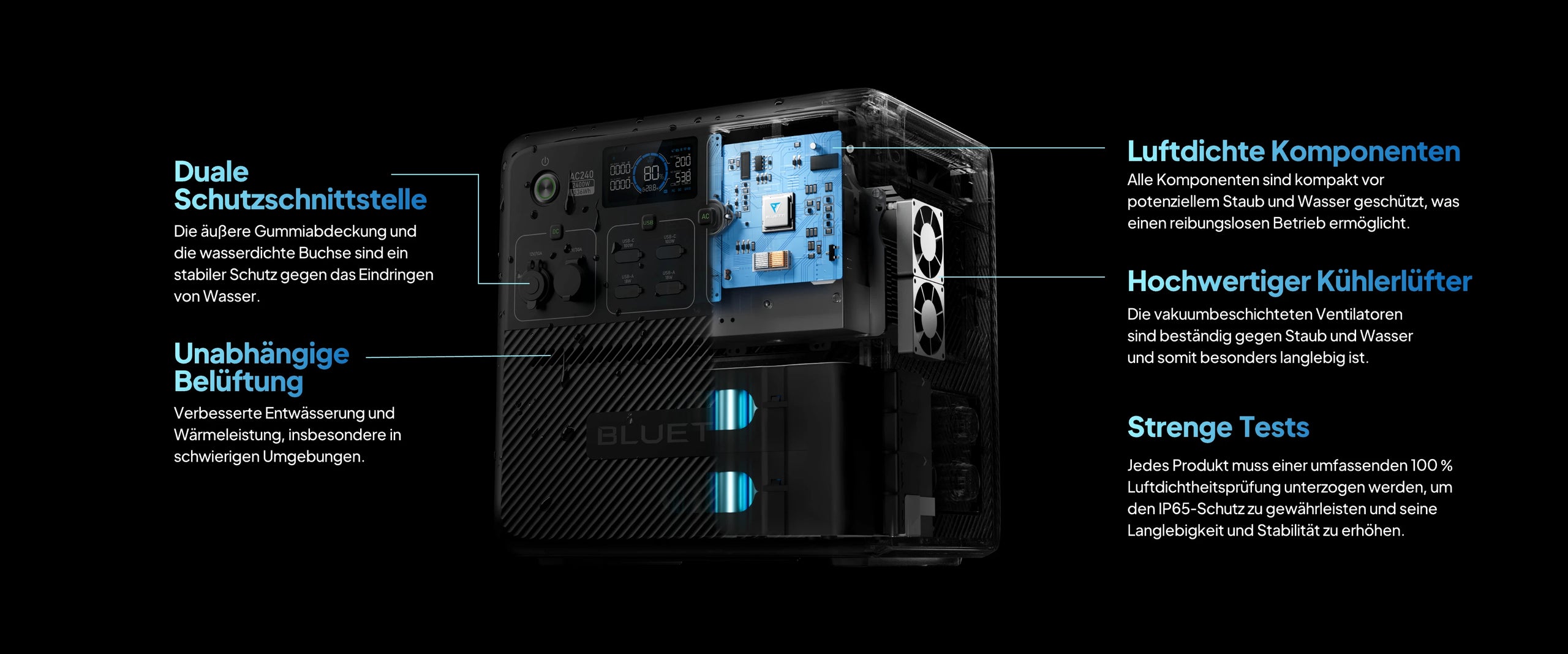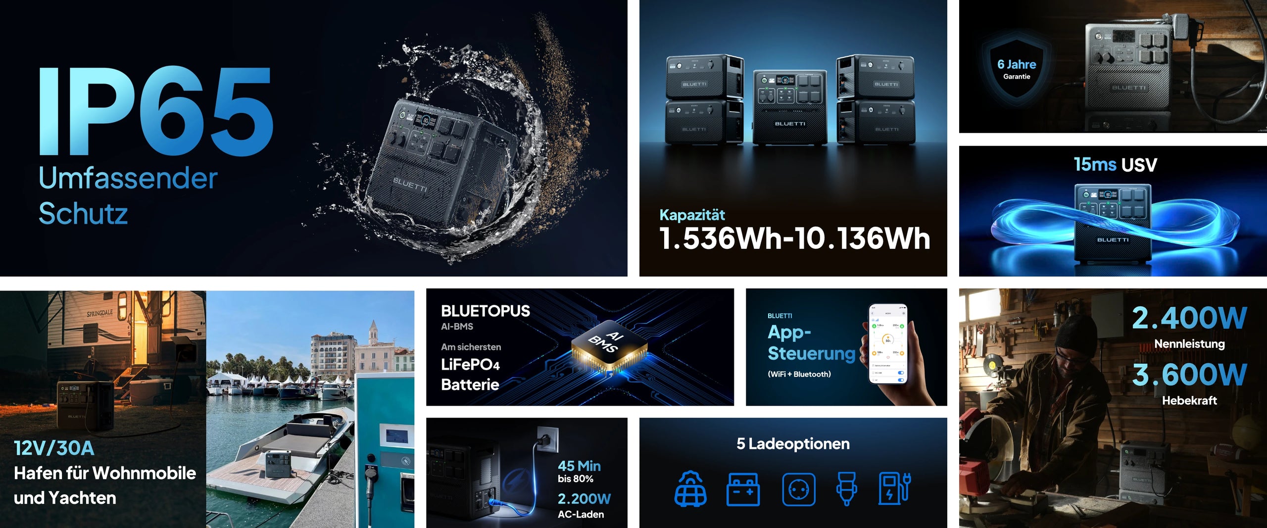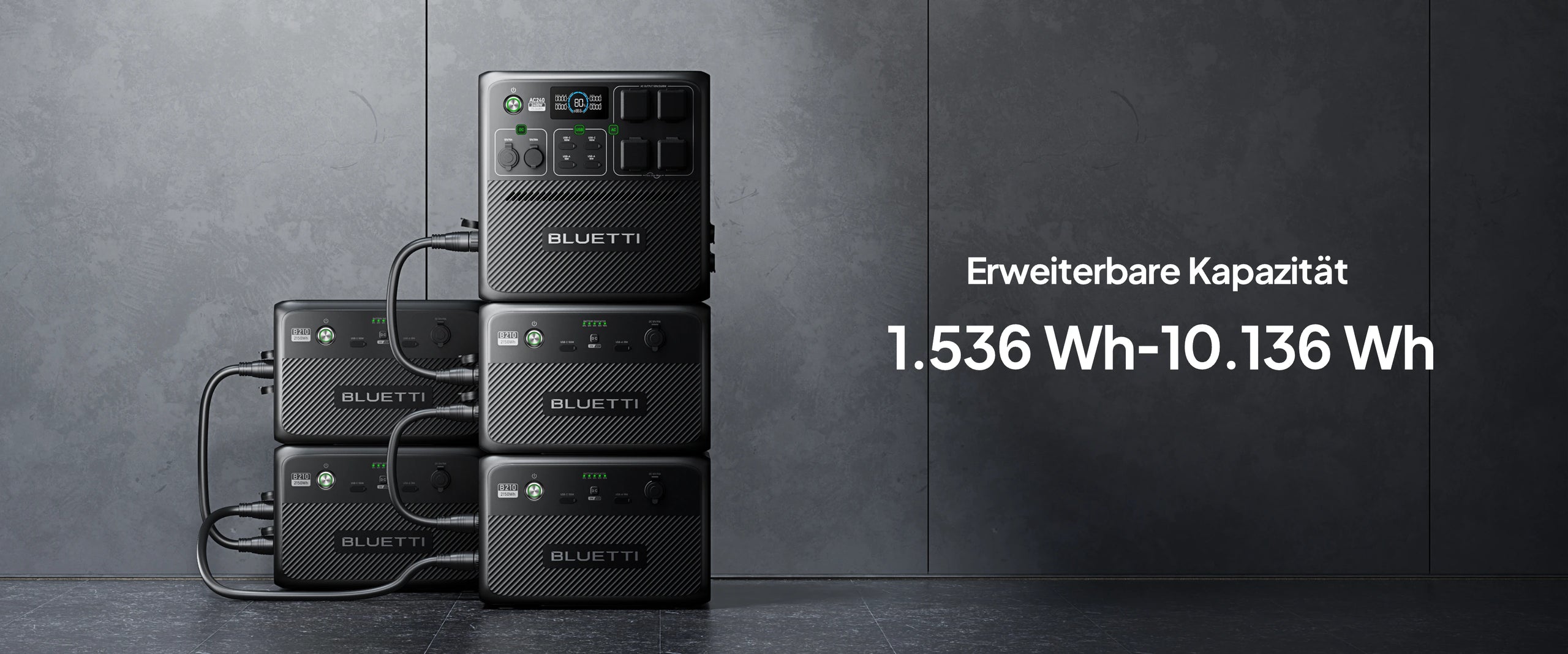 1536 Wh4 x 230 V/11 A (2.400 W insgesamt)2200 W max.1.200 W max.LiFePO₄ (Lithium-Eisen-Phosphat)BLUETTI App (WiFi/Bluetooth)41,95 x 29,35 x 40,95cm33kg