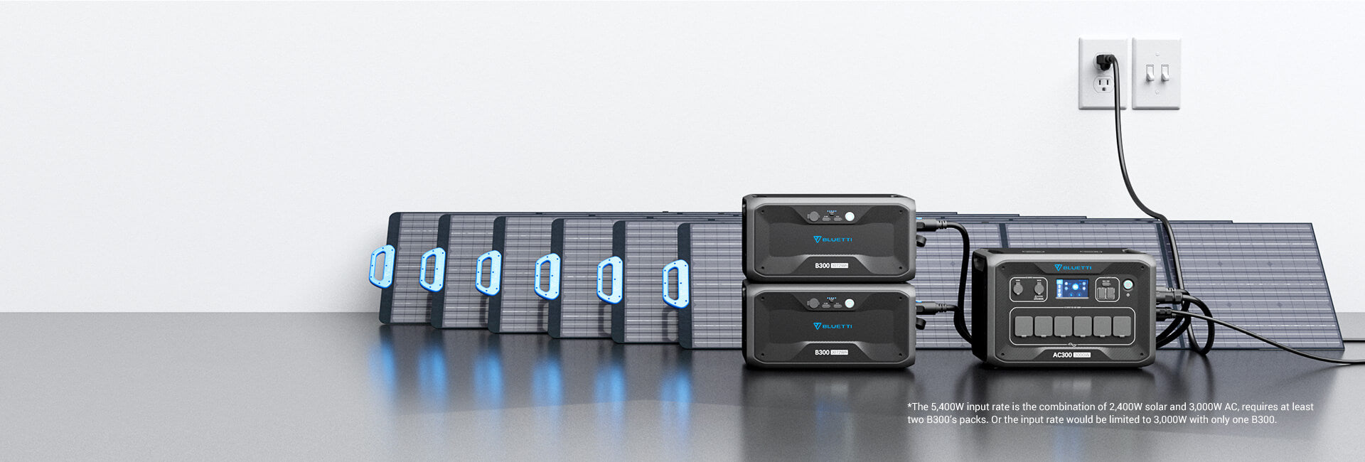 Für AC300 mit mehr als einer B300: 5.400 W max. Über 3.000-W-Netzanschluss und 2.400-W-Solarpanele gleichzeitig -