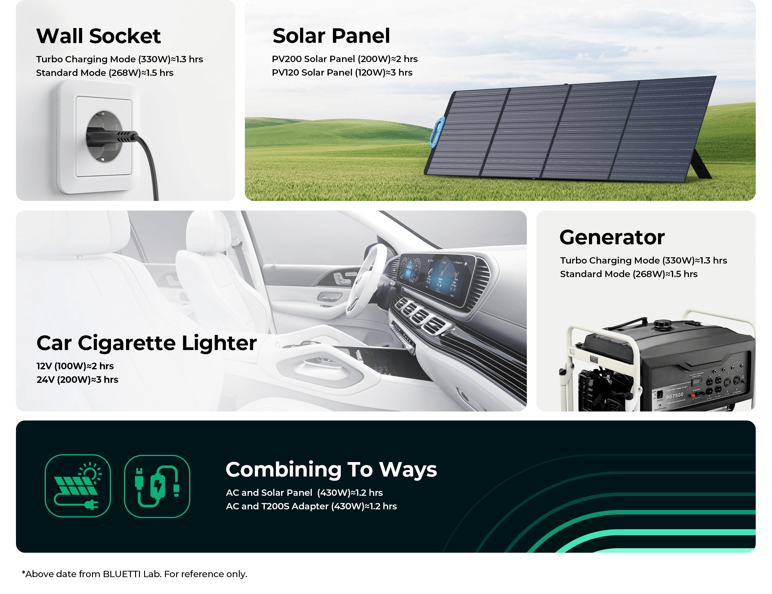 ≈1,1~1,6 Stunden (mit optionalem BLUETTTI T200S Adapter)