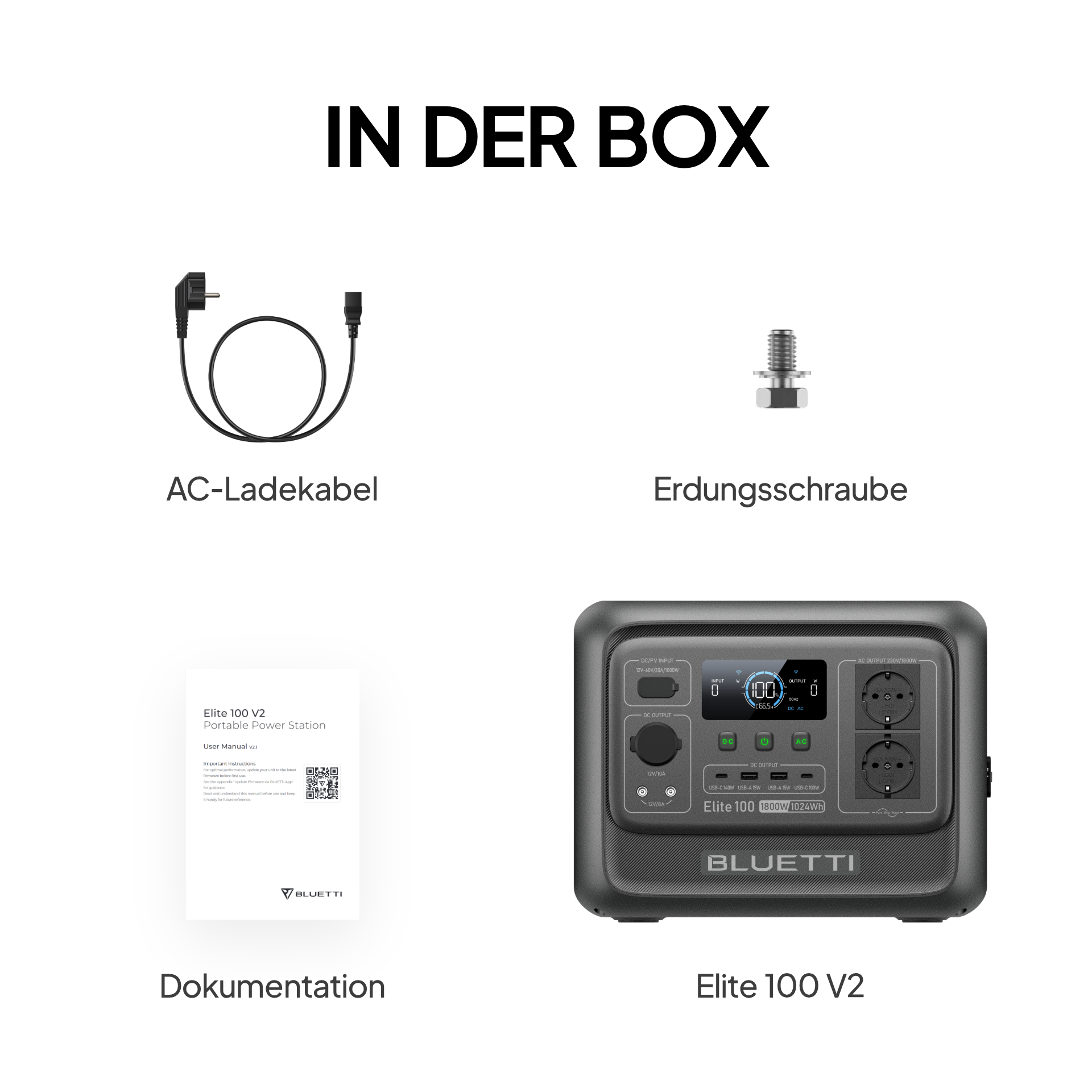 1× Elite 100 V2 Power Station, 1× AC-Ladekabel, 1× Solar-Ladekabel, 10× M5-Schrauben, 1× Benutzerhandbuch.