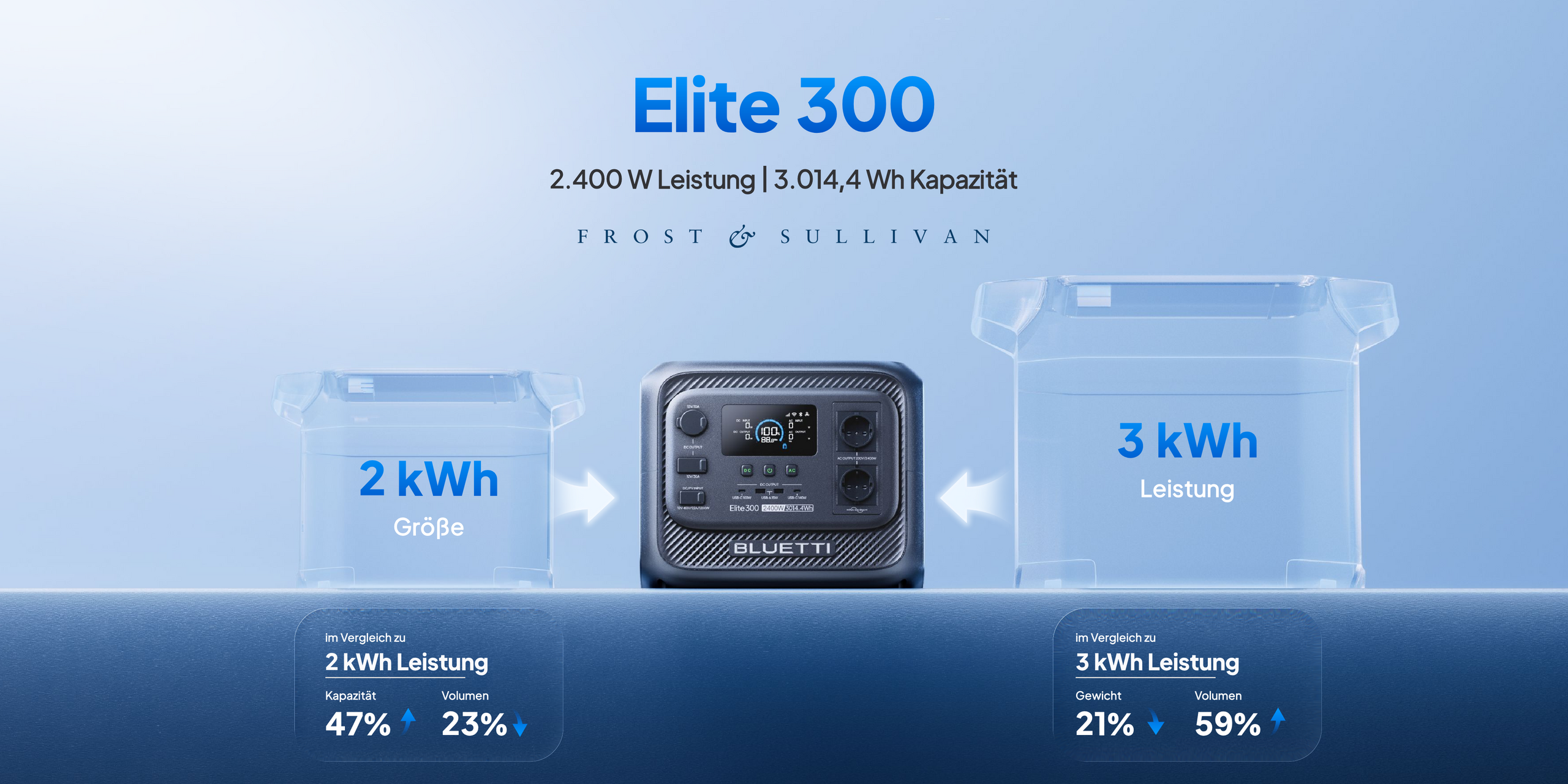 Die Elite 300 ist eine leistungsstarke tragbare Powerstation mit 3.014,4 Wh und 2.400 W Leistung. Sie eignet sich perfekt als Notstromversorgung für zu Hause, für Wohnmobilreisen, Outdoor-Aktivitäten und Notfälle.