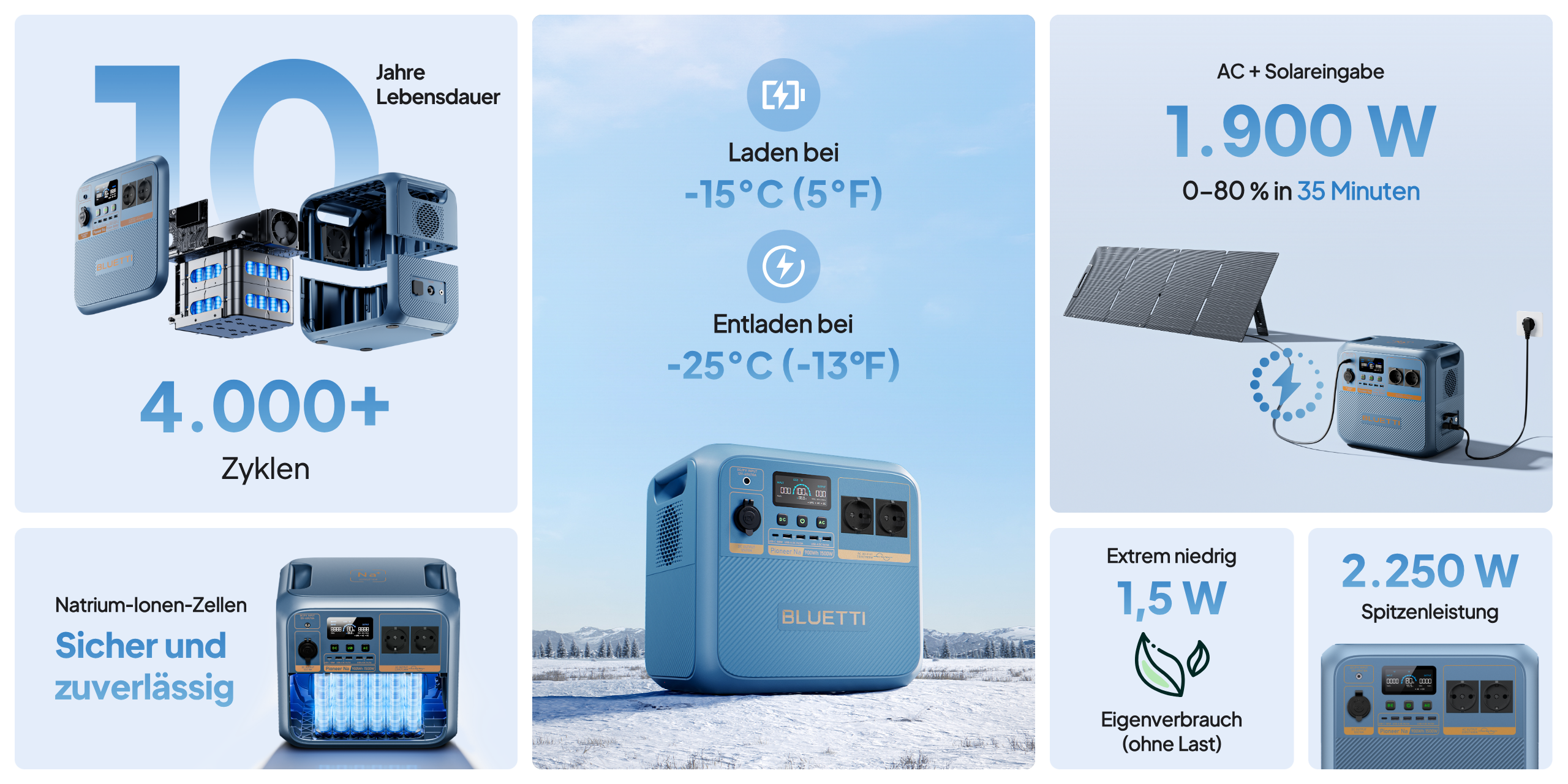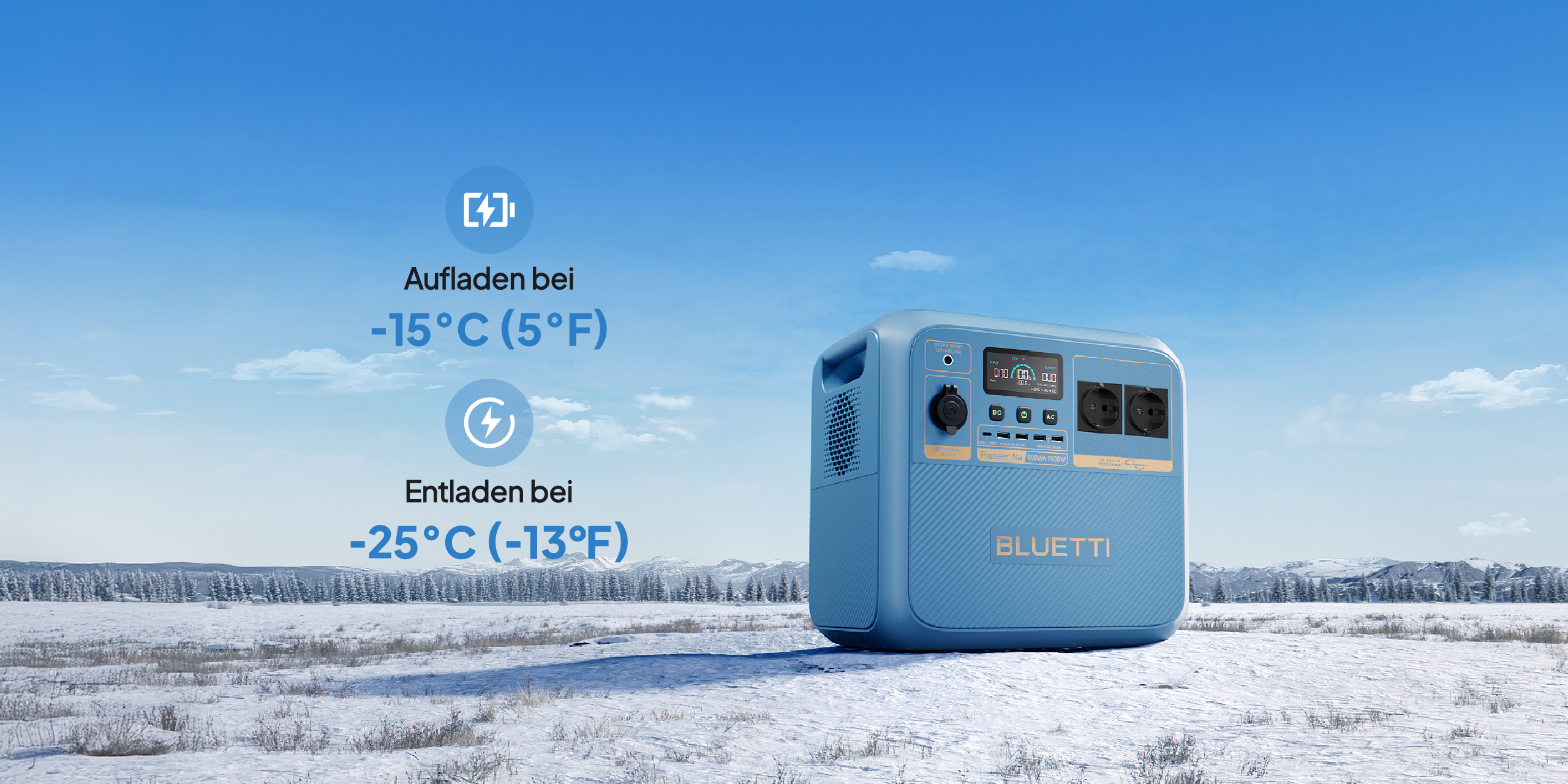 Hinweis: Bei -30 °C liefert er immer noch 75 % seiner Entladekapazität und versorgt Geräte mit bis zu 300 W.
