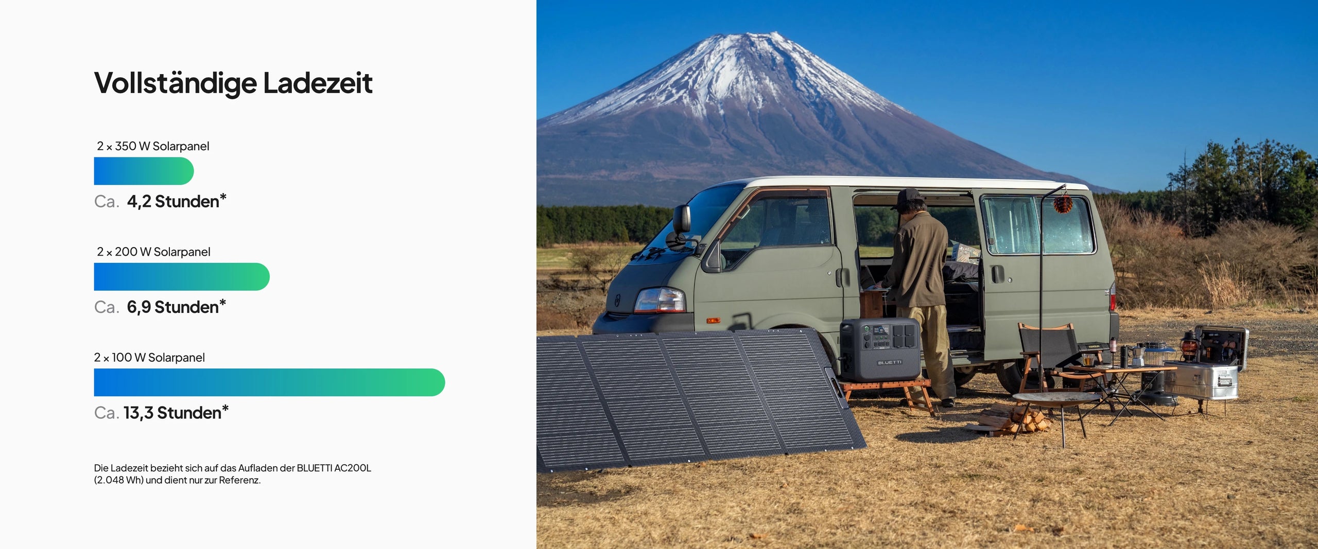 Beispielsweise sind zwei 350 W Solarpanels zum Aufladen der BLUETTI AC200P korrekt. Ein 350 W Solarpanel + ein SP350 in Kombination sollte nicht verwendet werden. -